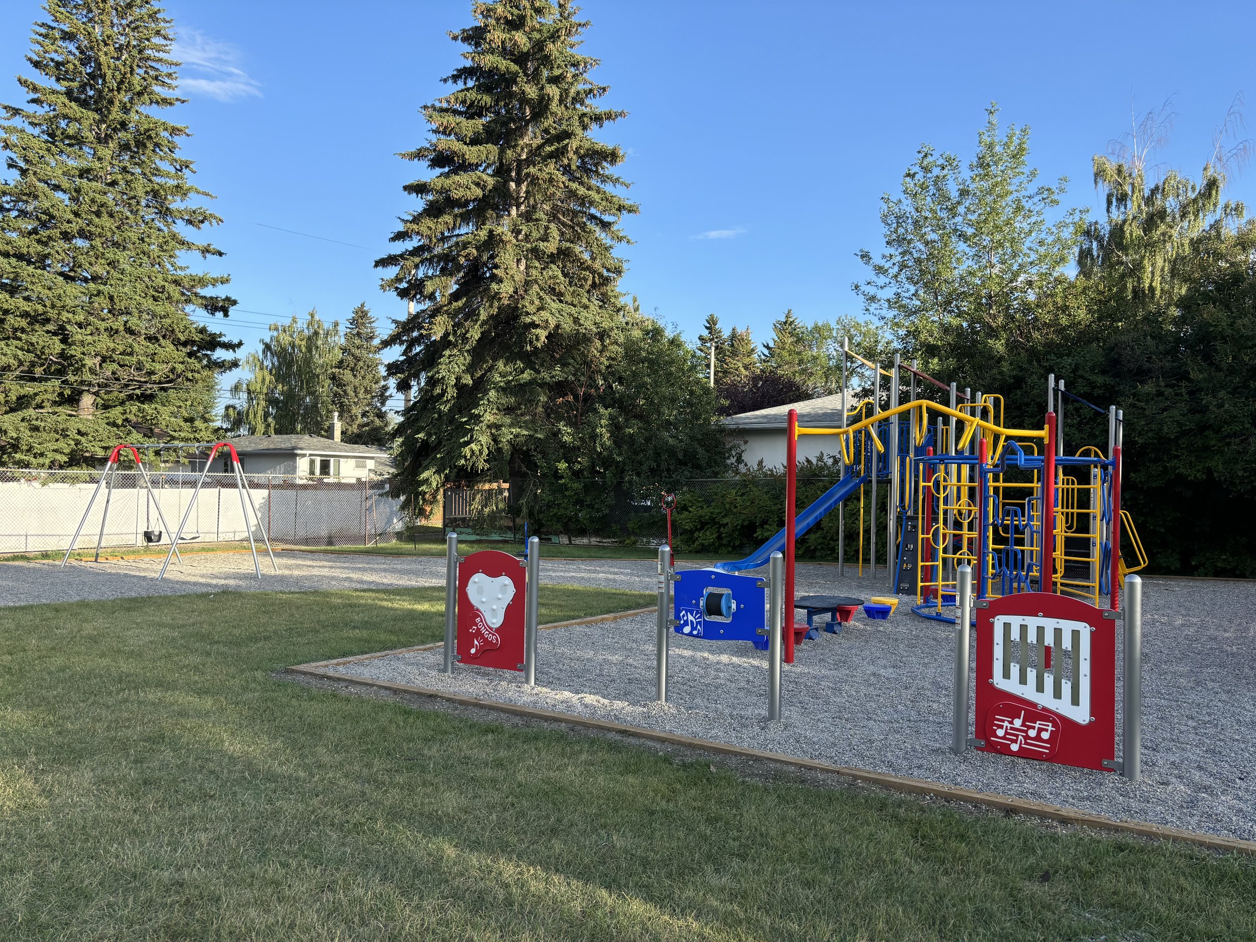 This site is hosting a City of Calgary Summer Park Pilot project for 2024. This pilot includes mini putt, ping pong, gaga ball and more! Picnic tables with umbrellas, adirondack chairs, and log benches provide lots of seating for when you aren't playing games.