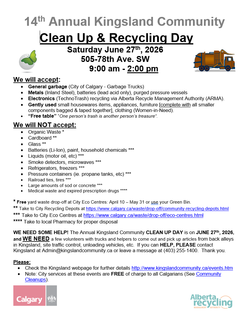 Clean Up & Recycling Day Saturday, June 27, 2026 9:00 a.m. 2:00 p.m. Kingsland Community Association 505 78 Avenue Southwest Calgary, AB, T2V 0T3 Canada (map) Google Calendar ICS Volunteer Sign-Up